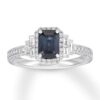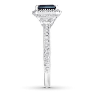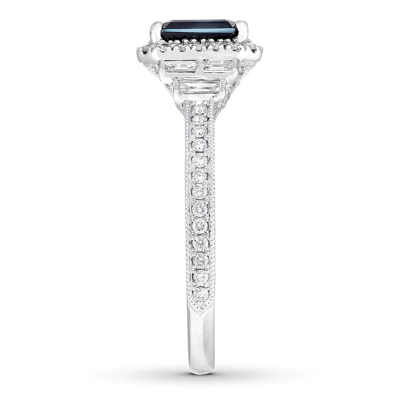 JewelrydesignerbringsArtDecostyleintothemodernerawiththisincredibleengagementring.Theemerald-cutnaturalsapphirecenterisframedbyrounddiamonds,whiletriosofbaguettediamondsshimmeroneithersidetocomplement.Thebanddisplaysmorerounddiamonds,delicatebeading,andcarvedflourishestocompletethedesign.Styledin14Kwhitegold,theringhasatotaldiamondweightof1/2carat.